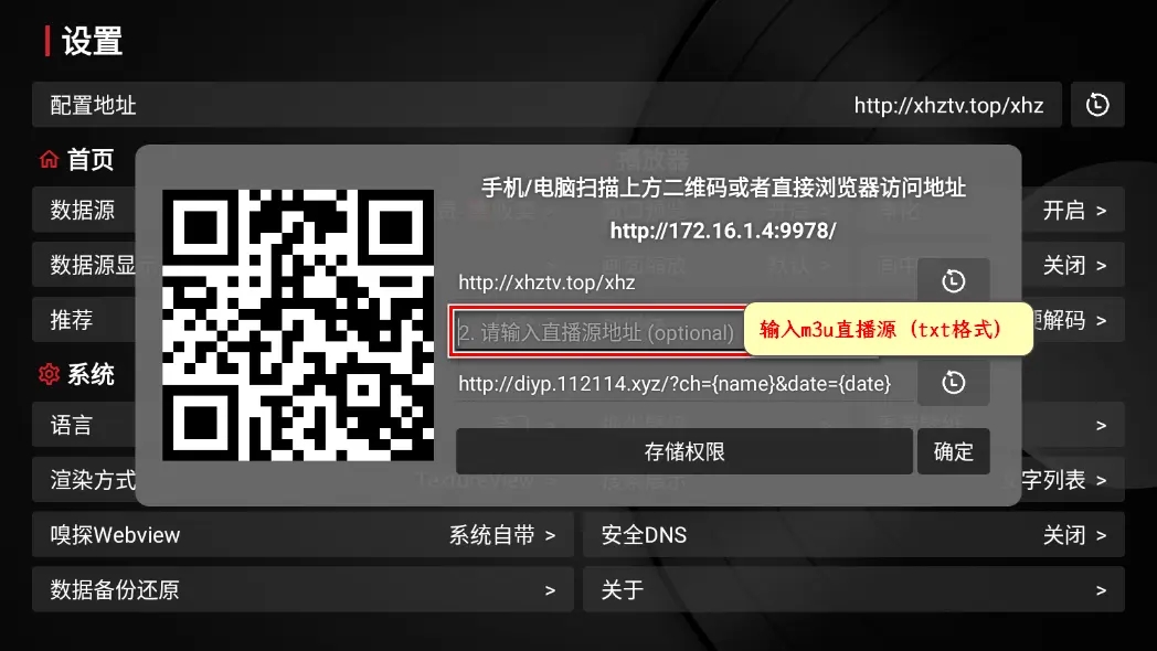 TVBox存储权限 然后用手机或者电脑扫描二维码或者填入上面👆 Json 数据源地址即可