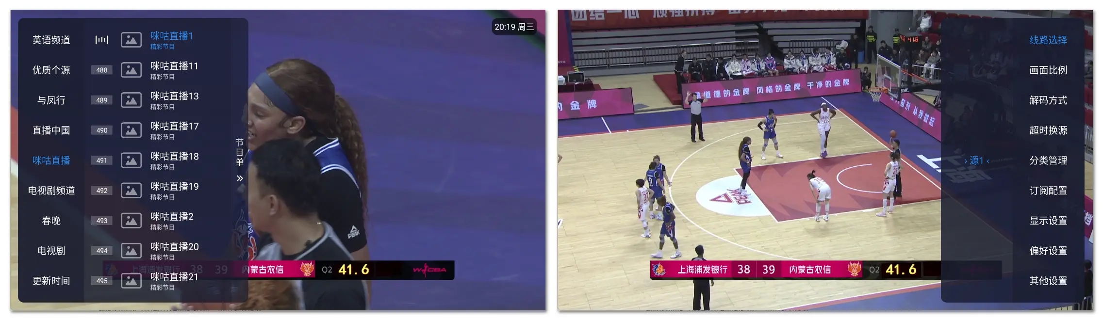 切换直播源:手机上点击屏幕右侧,电视按下菜单键即可在底部打开菜单,点击【肥羊直播】就能打开内置的直播源!肥羊的TPTV也有啦~