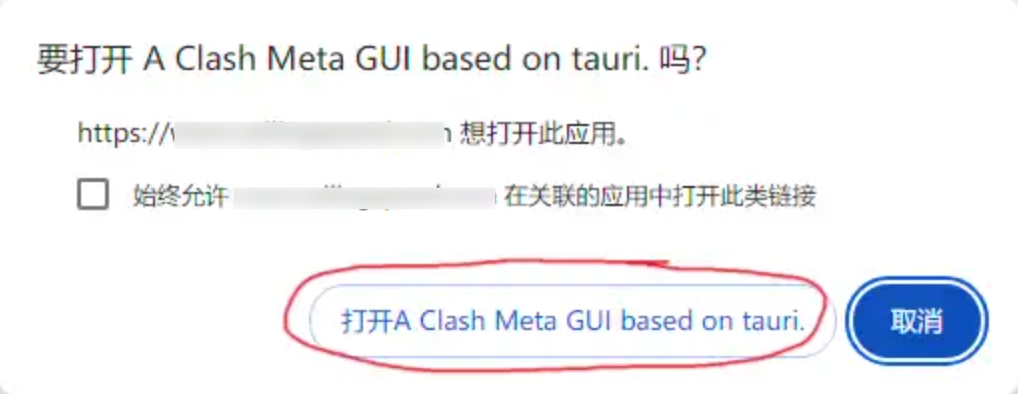 在弹出的提示框中点击红圈圈出的按钮即可导入订阅(该提示框可能于不同浏览器中有不同外观,本教程使用的是谷歌Chrome浏览器)