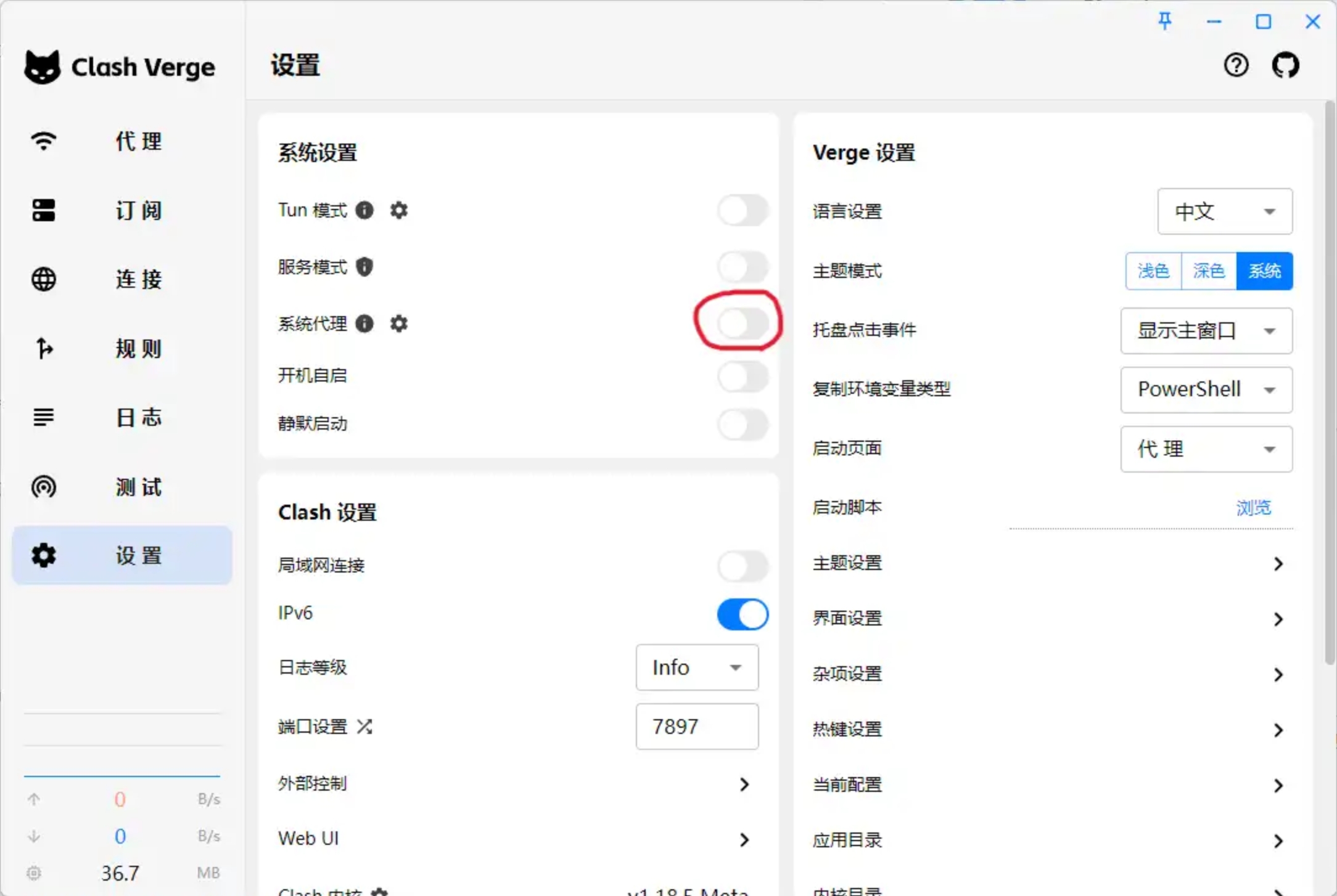 在Clash Verge的设置界面中打开图中红圈圈出的开关 大功告成,Enjoy(如果开启几分钟之后仍然没网请查阅常见问题一文)